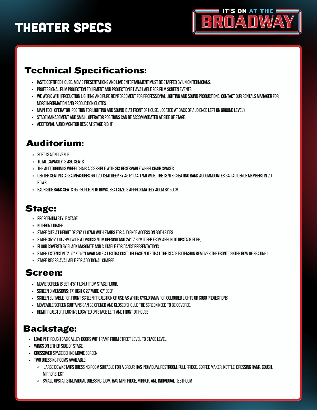 At the Broadway, we have three distinct elements: films, live music and other live events like theatre, dance or comedy. We also have a fourth dimension that covers “other rental”. This includes (but is not limited to):